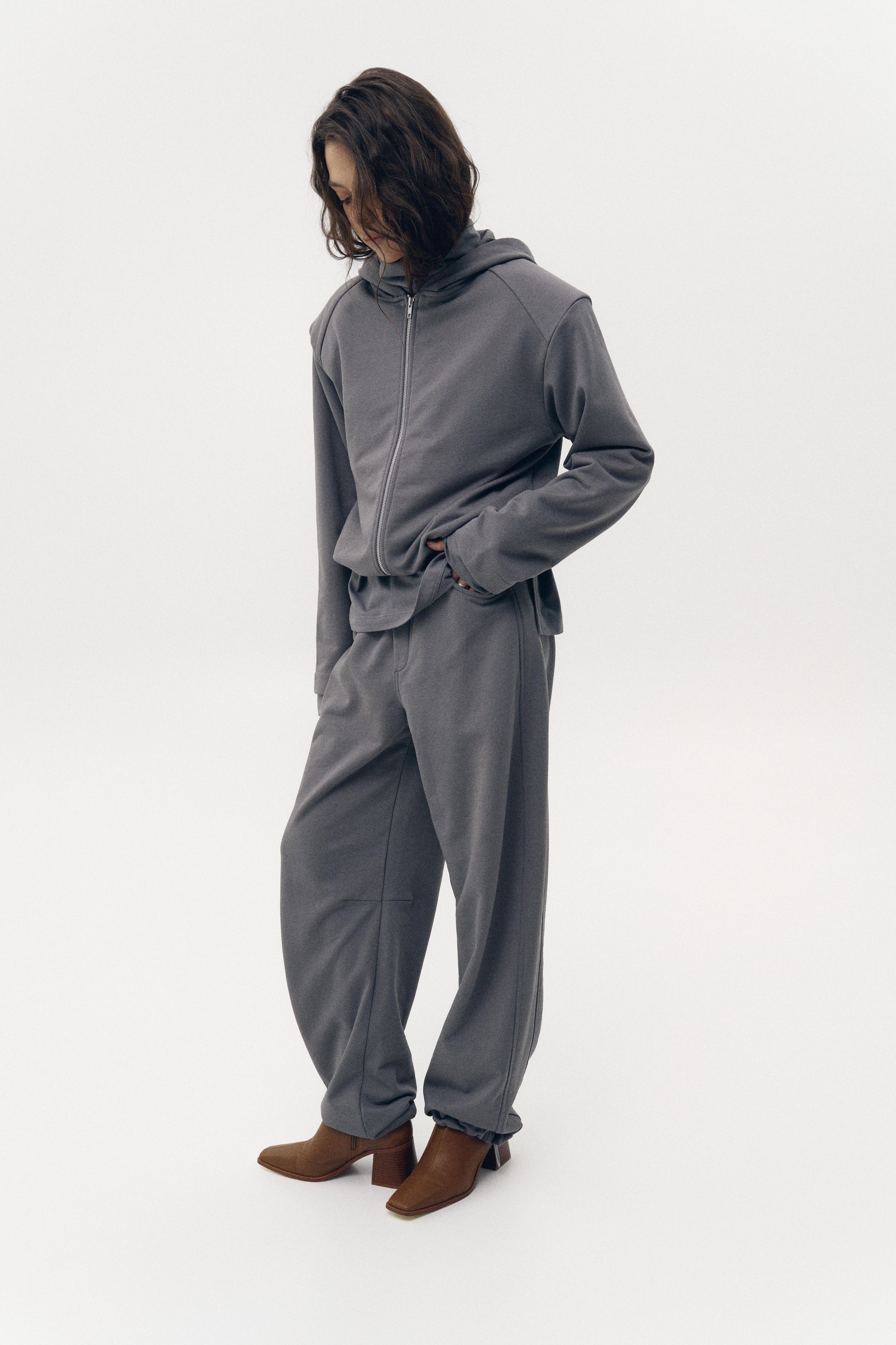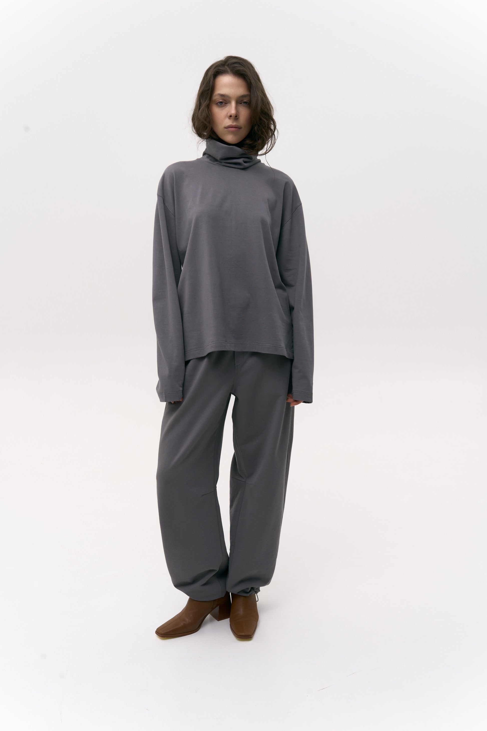 Комфортні штани середньої посадки з м'якого трикотажу. Завдяки еластичному поясу з резинкою та шльовкам під пояс вони забезпечують зручну посадку та універсальність у стилізації.Мають бокові кишені, зручні регульовані фіксатори з резиною внизу та декоративні шви на колінах, що створюють особливу посадку.