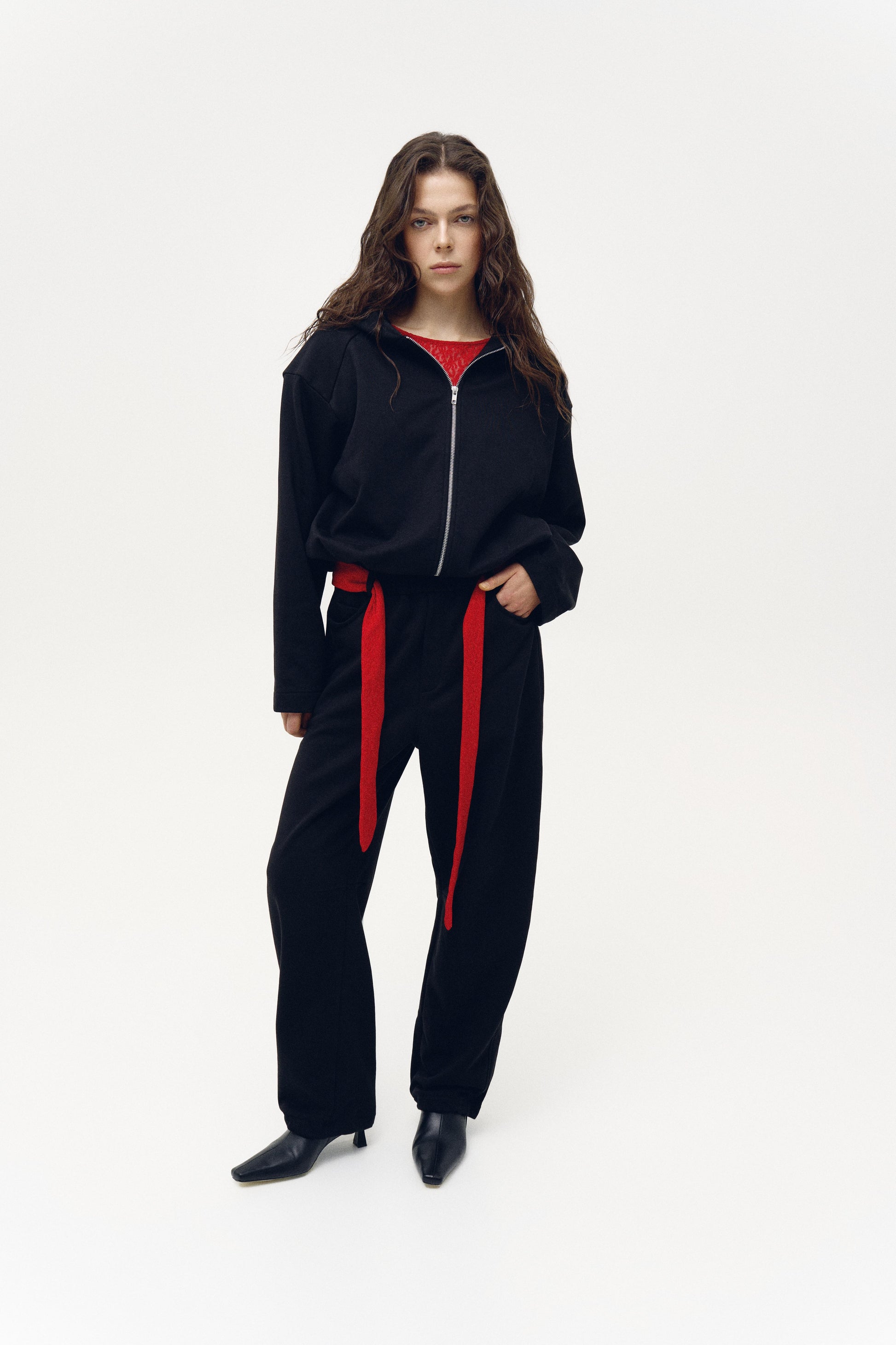 Комфортні штани середньої посадки з м'якого трикотажу. Завдяки еластичному поясу з резинкою та шльовкам під пояс вони забезпечують зручну посадку та універсальність у стилізації. Мають бокові кишені, зручні регульовані фіксатори з резиною внизу та декоративні шви на колінах, що створюють особливу посадку.