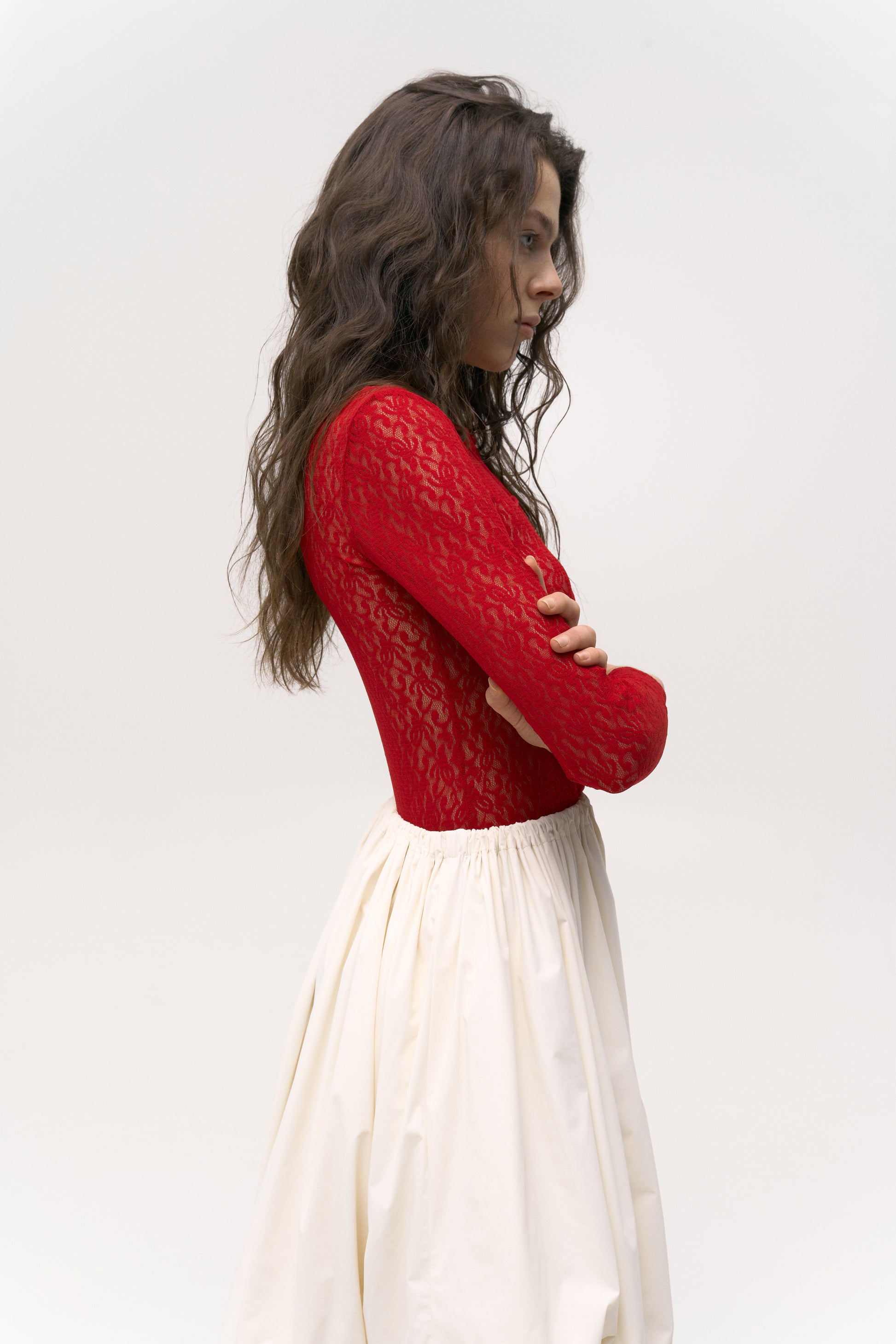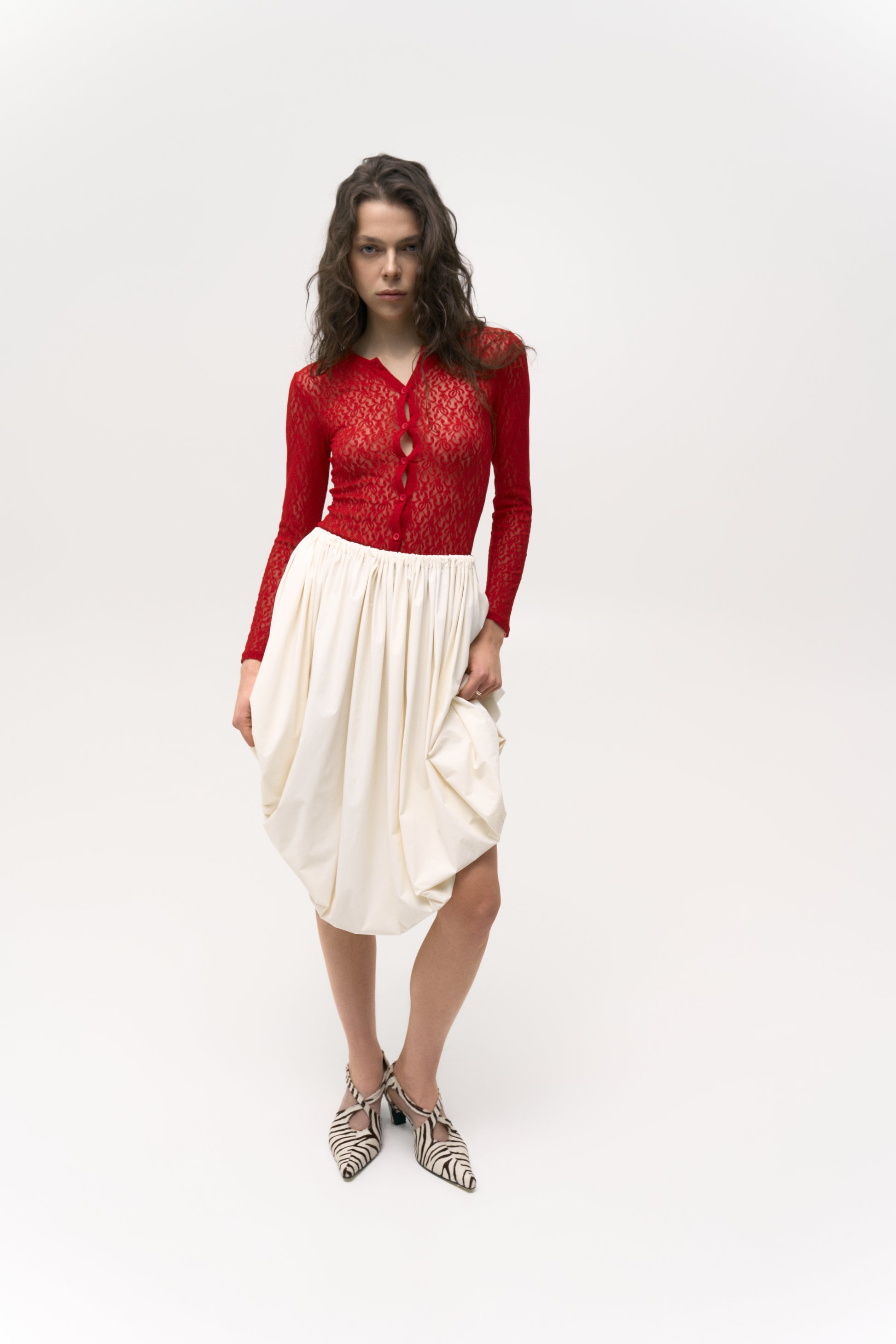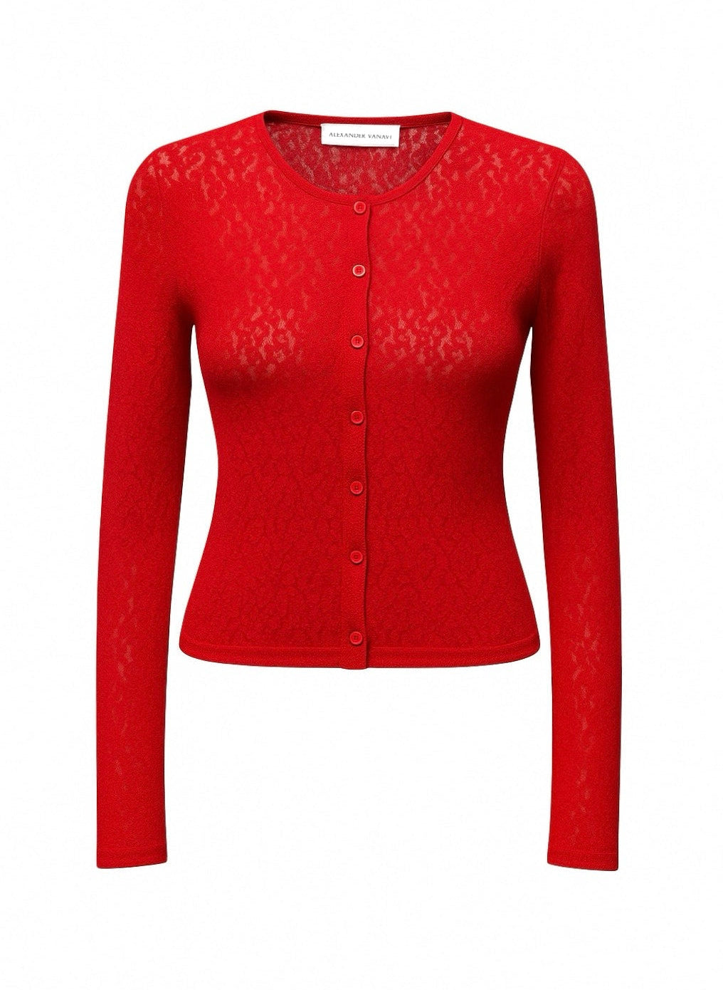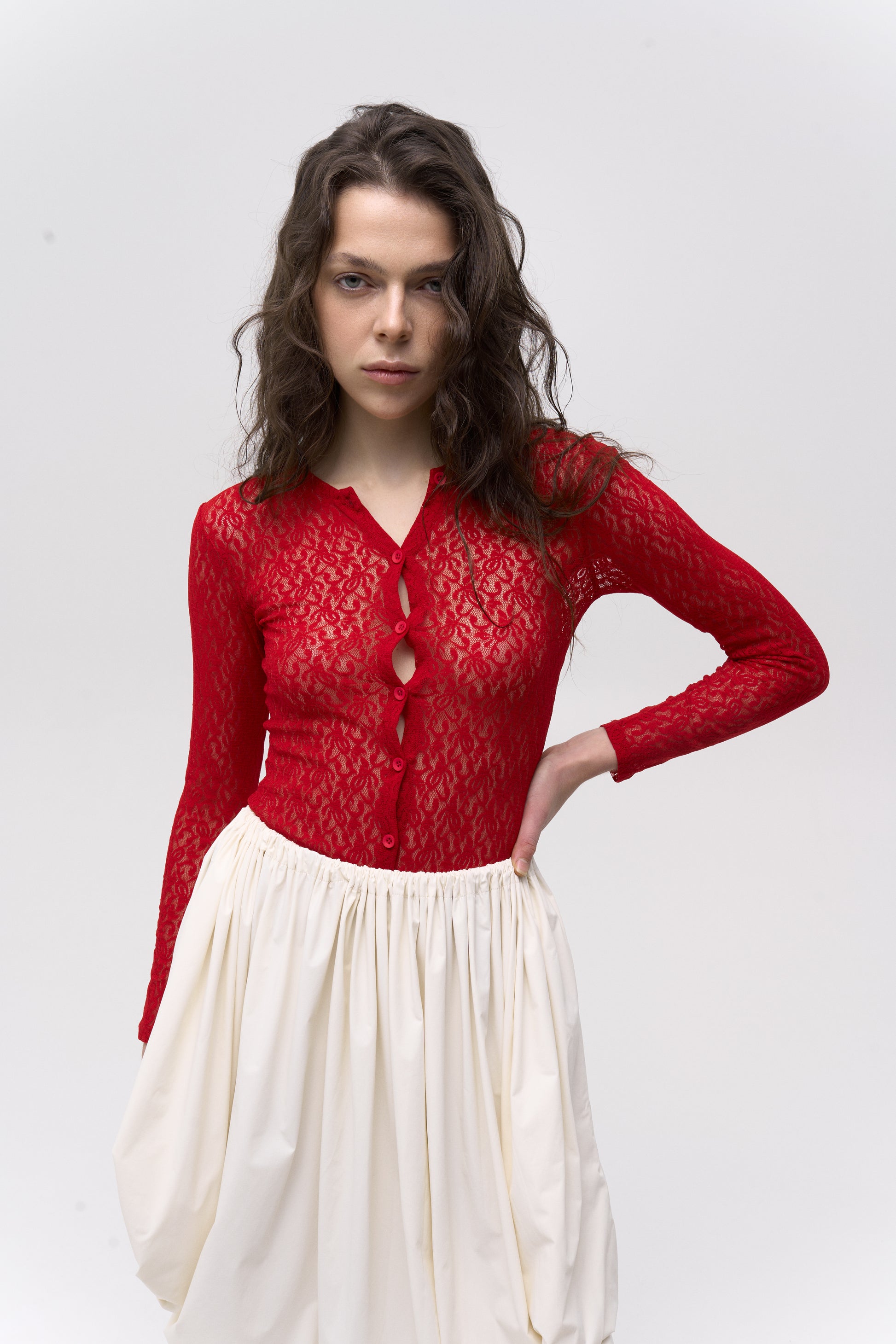 Топ-кардиган із червоного напівпрозорого мережива, це про матеріал і колір, які говорять першими. Про характер, пристрасть і сміливість бути помітною. Це річ, що створює настрій будь-якого образу, додаючи йому глибини та особливої енергії. Легкий, але виразний, він огортає тіло делікатно й відверто водночас. Ідеальний для тих моментів, коли хочеться не просто одягнутися, а відчути себе по особливому.